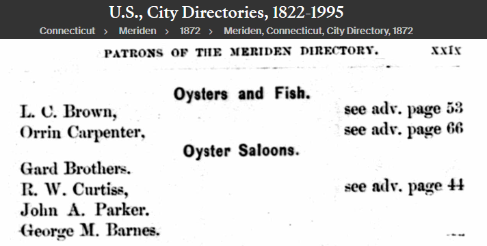 Having grown up together in Cheshire, brothers John Alan and William Henry moved to Meriden, Connecticut. Some time before 1872, they opened an oyster saloon together, under the name “Gard Brothers.” In the mid-nineteenth century, oysters were a cheap food, particularly in the coastal areas of Connecticut. Oyster saloons, a precursor to today’s fashionable oyster bars, were extremely popular; you can read more about them on Wikipedia. What Wikipedia does not tell you was that oyster saloons were sometimes associated with prostitution.2 Put a pin in that.