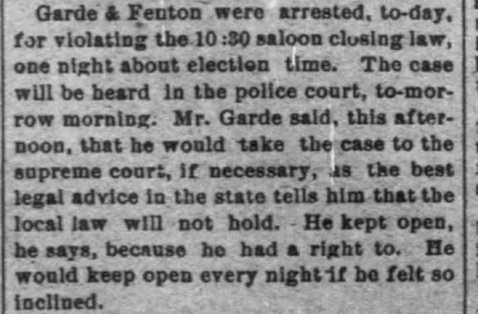 The partnership between the brothers didn’t last long. John Alan left the saloon business and did factory work for the remainder of his life. William Henry continued in the saloon business with other partners. In 1876 he was prosecuted for (and acquitted of) violating liquor laws, and in 1884 W.H. and his partner Albert Fenton were arrested for violating the saloon closing laws. Newspapers reported that Mr. Garde had announced his intention to challenge the law but it was shortly discovered that the partners had let their liquor license lapse. They were fined, and that appears to have been the end of the Sunday closing crusade.