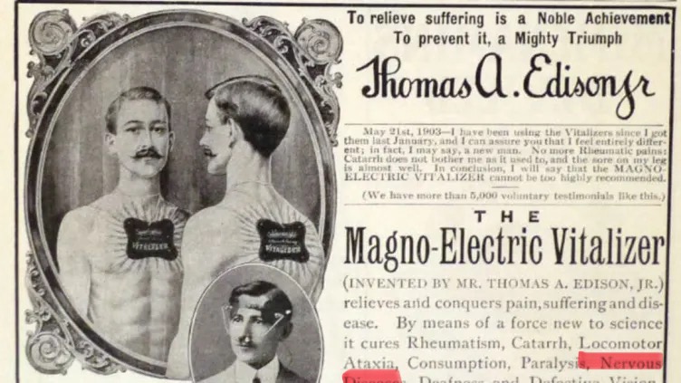 The “Magno-Electric Vitalizer” device was promoted by Thomas A. Edison, Jr., (son of the renowned inventor) before the company distributing it was shut down for fraud in 1904.